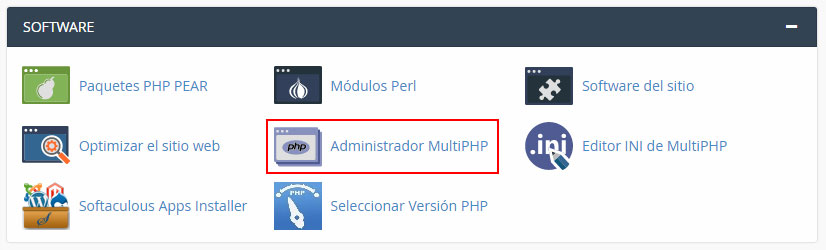 En la pantalla principal del panel, hac clic en el enlace "Administrador MultiPHP", ubicado dentro de la sección "Software".