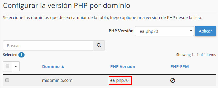Una vez aplicados los cambios, el dominio tendrá la versión de PHP seleccionada.