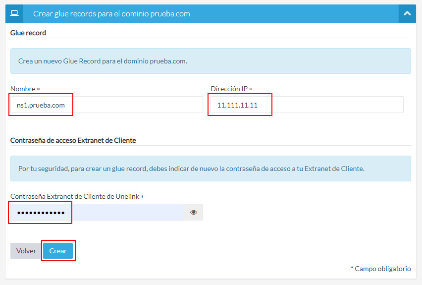 Indica el nombre, la dirección IP y tu contraseña de acceso a la Extranet de Cliente y, finalmente, pulsa Crear.