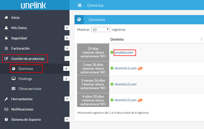 Accede al listado de dominios haciendo clic en el enlace Dominios dentro de la sección Gestión de productos. Busca el dominio para el que quieres crear los Glue Records y haz clic en su nombre.