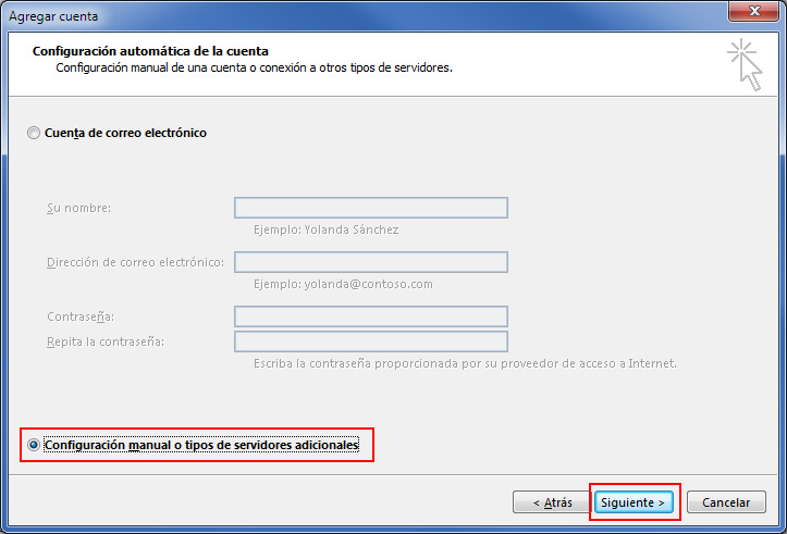Selecciona la opción Configuración manual o tipos de servidores adicionales y pulsa en el botón Siguiente.