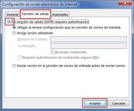 Dentro de las opciones avanzadas pulsa en la pestaña Servidor de salida, selecciona Mi servidor de salida (SMTP) requiere autenticación y pulsa el botón Aceptar.