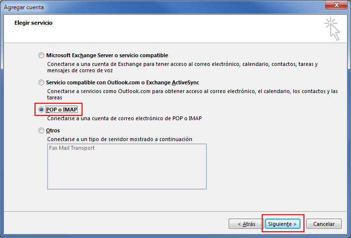 Selecciona la opción POP o IMAP y pulsa en el botón Siguiente.