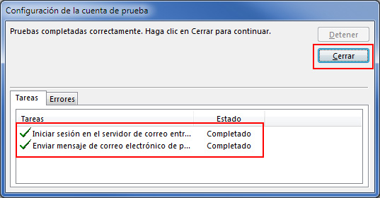 Outlook comprobará la configuración de la cuenta. Si has puesto todos los datos correctamente, las pruebas se complatarán correctamente. Si es así, pulsa en el botón Cerrar.