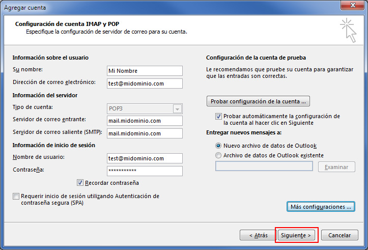 Otro campo importante es Nombre de usuario. Outlook lo autorellena de forma automática, pero recuerda que tienes que poner la cuenta de correo completa, del tipo "test@midominio.com".
