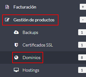 Accede al listado de dominios haciendo clic en el enlace "Dominios" dentro de la opción de menú"Gestión de Productos".