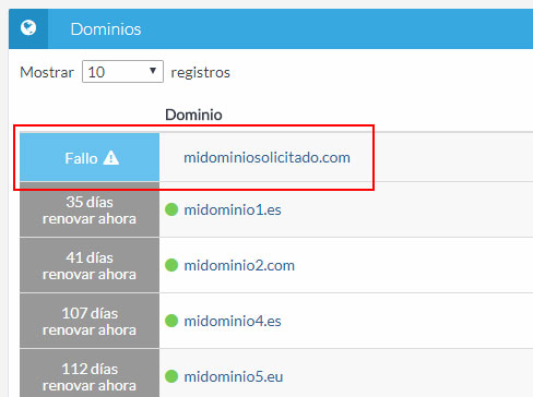 En el listado de dominios, junto con los dominios que ya tengas contratados, verás aquellos que estén en proceso tanto de traslado como de registro.