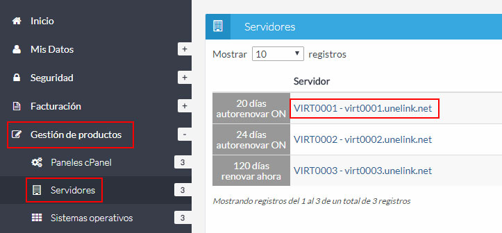 Accede al listado de servidores dedicados haciendo clic en el enlace "Servidores" dentro de la sección "Gestión de productos". Busca el servidor para el que quieres consultar la contraseña del panel y haz clic en la referencia.
