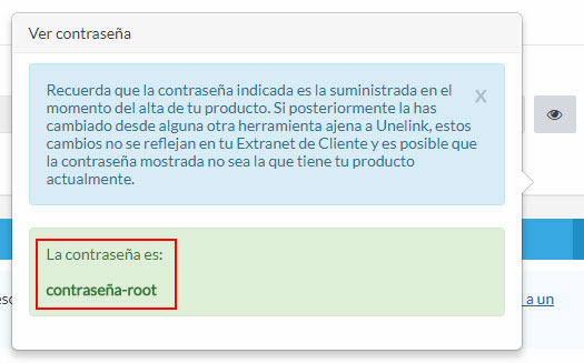 La contraseña mostrada es la que tenía el servidor en el momento de la entrega. Si cambias la contraseña más adelante, esta no se refleja en tu Extranet de Cliente, por lo que asegúrate de anotarla y guardarla en un lugar seguro.