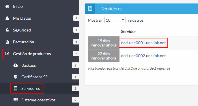 Haz clic en el enlace "Servidores", dentro de la sección "Gestión de Productos", busca el servidor para el que quieres consultar la contraseña de root y haz clic en su referencia.