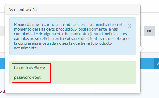 Recuerda que, si tras la entrega de tu servidor has cambiado esta contraseña desde cualquier vía ajena a Unelink (por SSH, por ejemplo), la nueva contraseña no se verá reflejada en la Extranet de Cliente, por lo que la contraseña mostrada no será la que tiene el virtual actualmente.