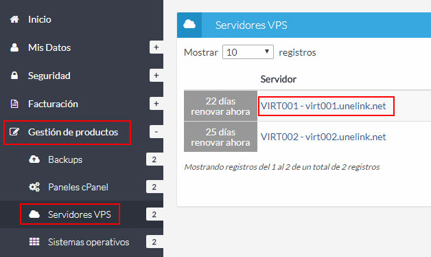 En el apartado "Gestión de productos" haz clic en el listado de productos al que pertenece aquel para el que quieres consultar sus características, y después haz clic en su referencia. En esta entrada vamos a utilizar como ejemplo los servidores VPS.