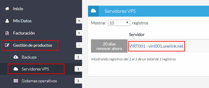 Haz clic en "Servidores VPS" dentro de la sección "Gestión de productos". Busca el servidor para el que quieres consultar sus facturas asociadas y haz clic en su referencia.