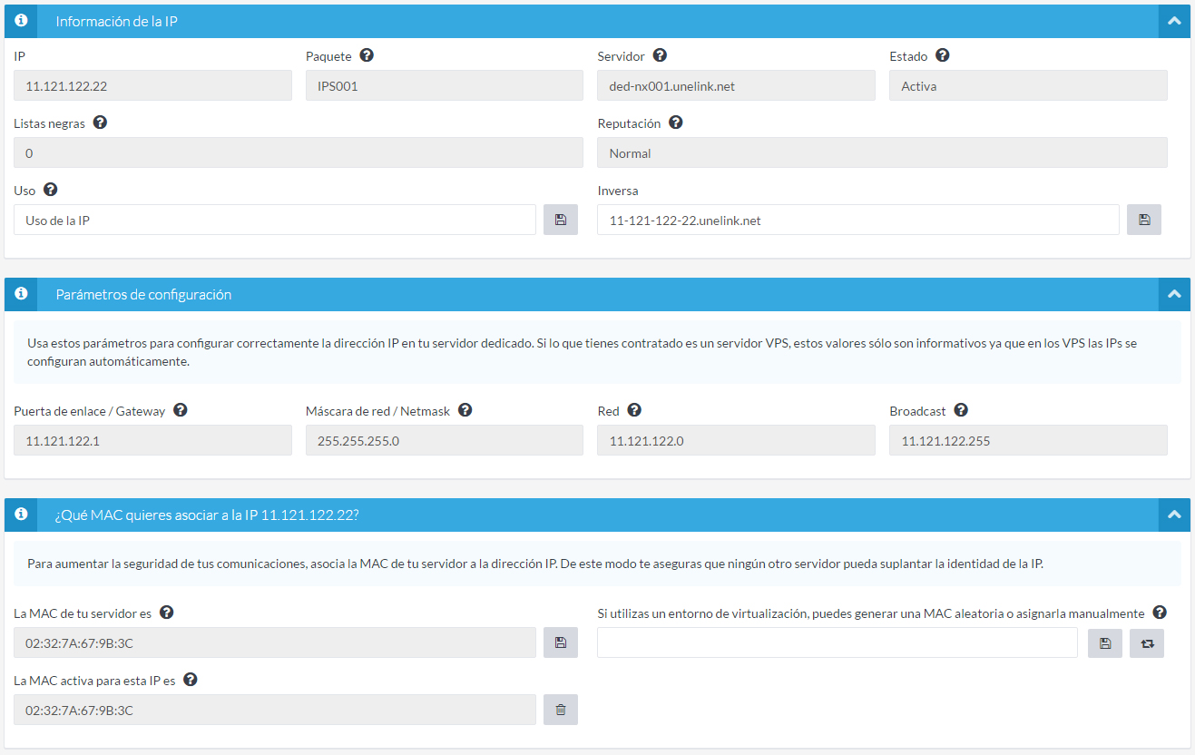 Si tenéis que realizar configuraciones manuales en vuestros servidores, esta información os será de gran ayuda ya que no sólo se incluye información general de la IP, si no que también podéis encontrar parámetros de configuración como la máscara de red, la puerta de enlace, dirección de broadcast o la MAC.
