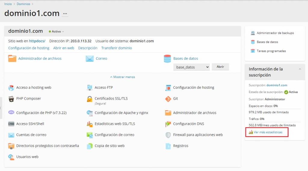 Nos aparecerán todas las opciones disponibles del dominio, debemos hacer clic en la opción "Ver más estadísticas" ubicada en la parte inferior del menú lateral derecho.