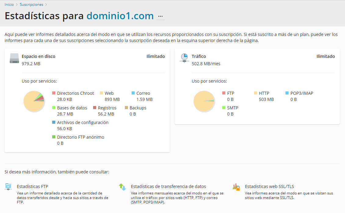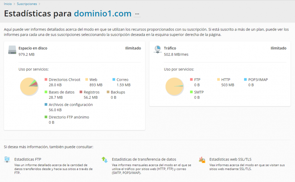 Tras esto, nos aparecerá toda la información del espacio en disco y el tráfico del dominio deseado.