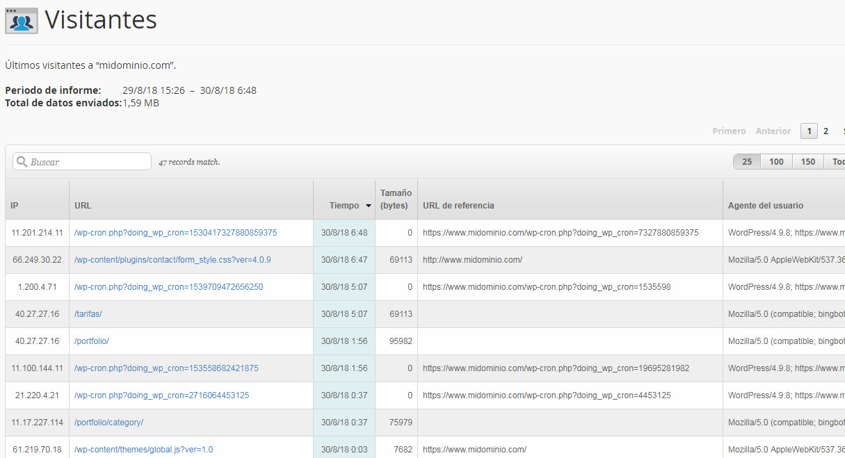 Se te mostrará una tabla con datos de los últimos visitantes de tu página web.