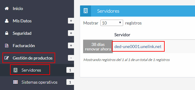 Haz clic en el enlace "Servidores", en la sección "Gestión de productos". Busca el servidor dedicado para el que necesitas el sistema de backup y haz clic en su referencia.
