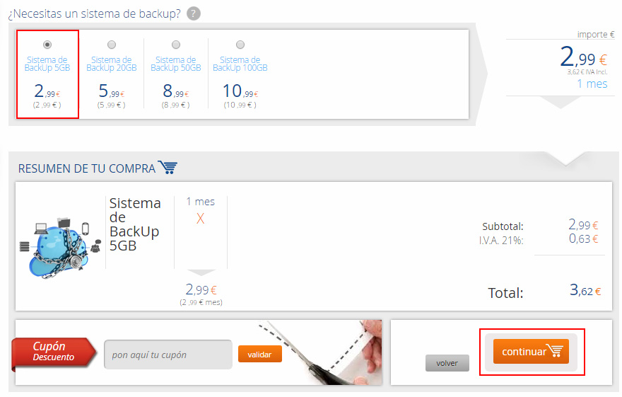 En la siguiente ventana selecciona el periodo y el espacio que necesitas y sigue los pasos de compra. Una vez finalizada, ya tendrás el sistema de backup contratado para que configures tus copias de seguridad.