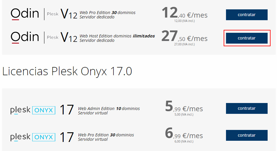 En la siguiente ventana tendrás todas las licencias disponibles. Elige, entre todas las disponibles, la versión de Plesk que necesites y pulsa el botón "contratar".
