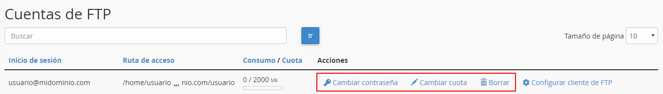 Desde este listado puedes modificar la contraseña, cambiar la cuota o borrar el usuario.