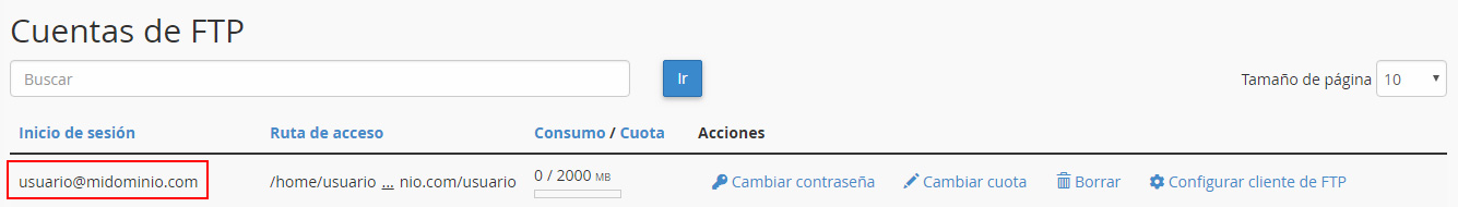 Tras crear la cuenta, el nuevo usuario aparecerá en el listado de cuentas de FTP.