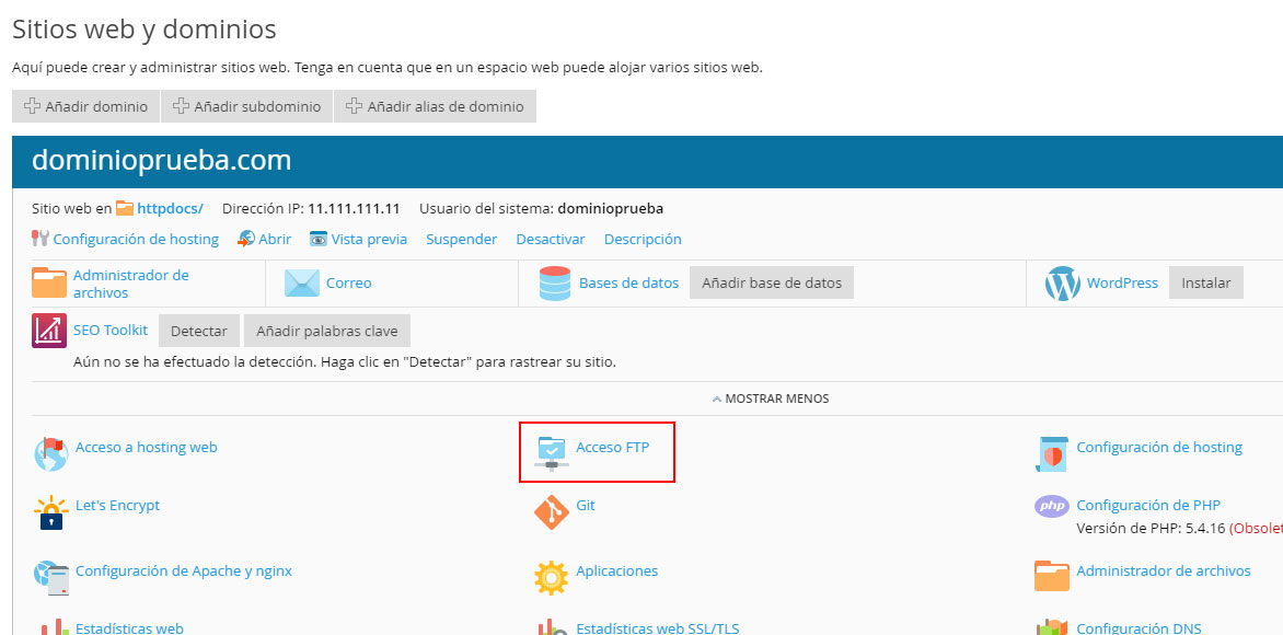 Se desplegarán las opciones disponibles para el dominio. Haz clic en Acceso FTP.
