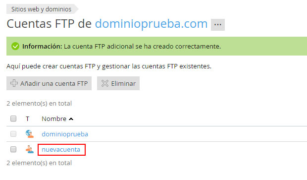 Ya estará la cuenta creada y aparecerá en el listado de cuentas FTP.