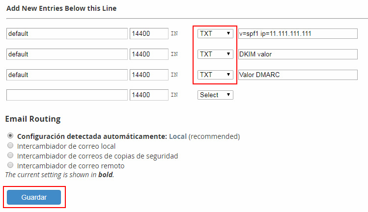 En la parte inferior añade tres registros de tipo TXT, indica los valores correspondientes a cada uno (SPF, DKIM y DMARC) y pulsa el botón Guardar.