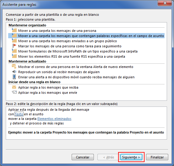 Una vez seleccionada la carpeta, pulsa el botón Siguiente dentro del asistente para reglas.