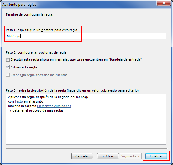 Tan solo queda que indiques un nombre para la regla y pulses el botón Finalizar.