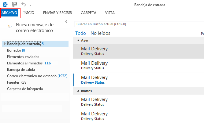 Para crear una regla lo que tienes que hacer es pulsar en la opción Archivo de la ventana principal de Outlook.