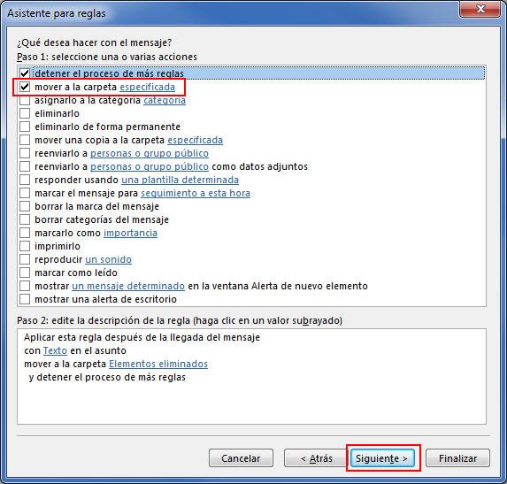 En el siguiente paso selecciona la acción "mover a la carpeta especificada" y pulsa el botón Siguiente.