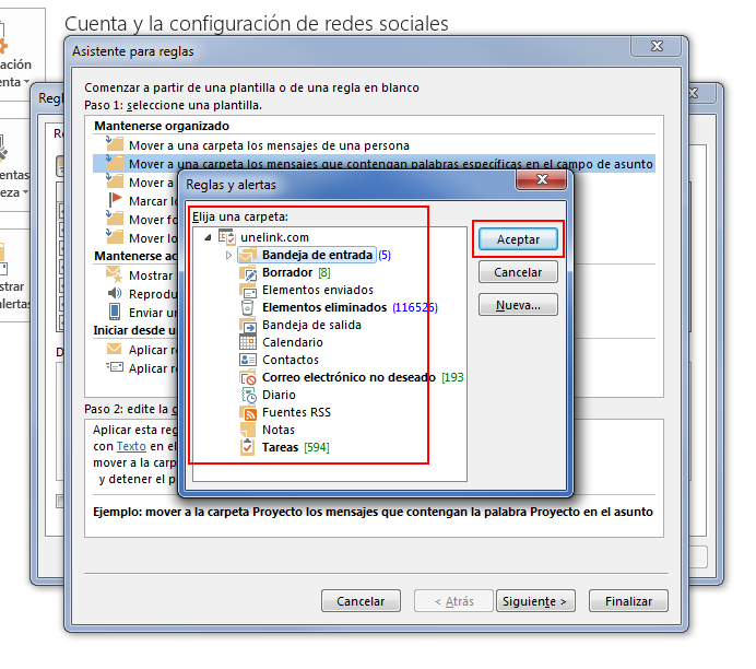 Crear reglas en Outlook para mover correos electrónicos a carpetas dependiendo del asunto