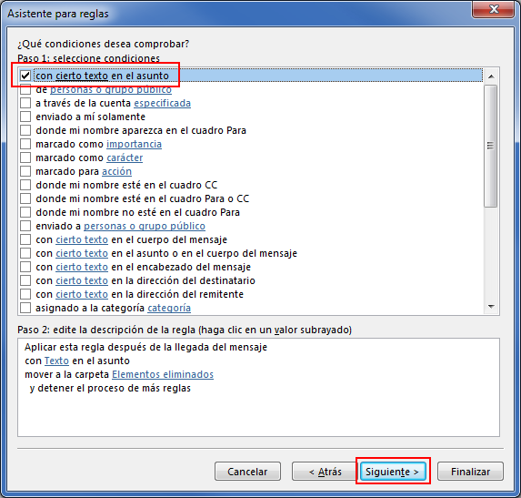 En el siguiente paso del asistente, selecciona la condición "con cierto texto en el asunto" y pulsa el botón Siguiente.