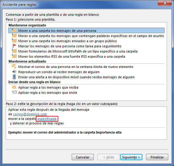 Una vez indicada la cuenta de correo, indica la carpeta a la que quieres mover los correos que provengan de ese email. Para ello haz clic en la palabra "especificada".