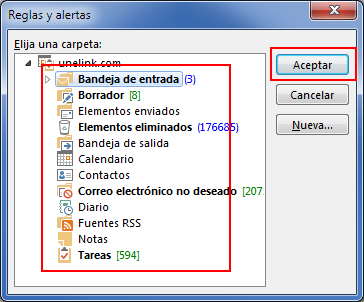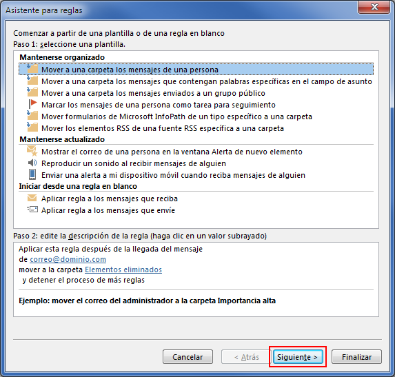 Una vez seleccionada la carpeta, pulsa el botón Siguiente dentro del asistente para reglas.