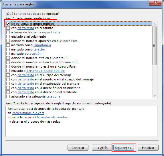 En el primer paso del asistente para reglas, selecciona "Mover a una carpeta los mensajes de una persona" y en la parte inferior haz clic en el enlace "personas o grupo público" para especificar la cuenta de correo desde la que tiene que proceder el email.