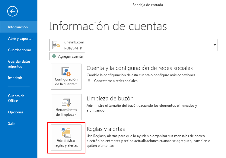 En la ventana de Información y cuentas, pulsa en el botón Administrar reglas y alertas.