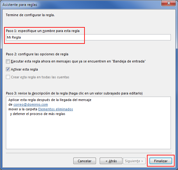 Tan solo queda que indiques un nombre para la regla y pulses el botón Finalizar.