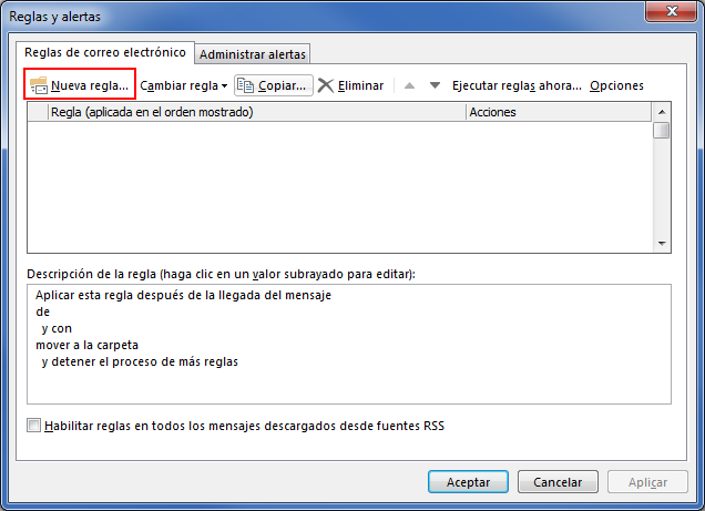 En la ventana de Reglas y alertas pulsa en el botón Nueva regla para empezar a definir las condiciones que se tienen que cumplir.