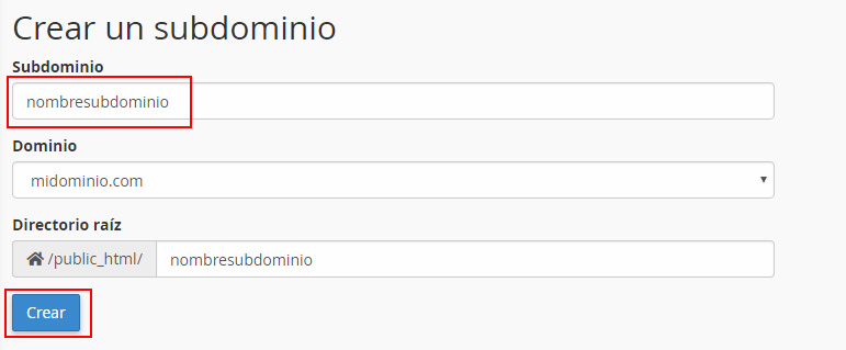 Ahora tan solo tenéis que introducir el nombre que queréis para vuestro subdominio y pulsar el botón "Crear".