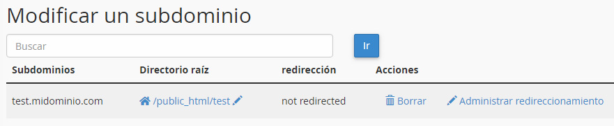 Una vez creado el subdominio, os aparecerá en el listado que hay justo debajo del formulario de alta y lo podréis gestionar desde ahí.