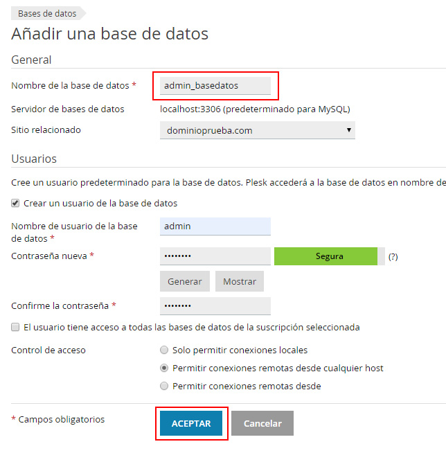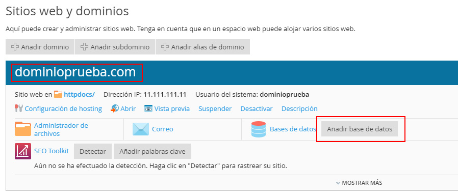 Y con estos sencillos pasos ya tendrás creada la base de datos para el dominio.