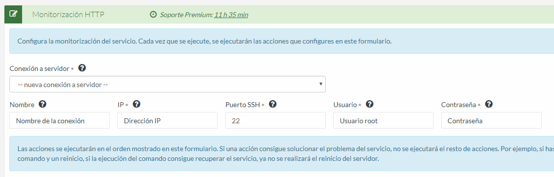 Esto se consigue con las "conexiones a servidores" que puedes crear al dar de alta un servicio a monitorizar. Estas conexiones se componen de un nombre descriptivo para que las identifiques fácilmente, la IP del servidor, el usuario y contraseña de acceso "root" y el puerto por el que se puede acceder por SSH.