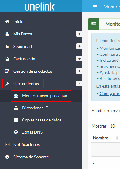 Haz clic en el enlace Monitorización proactiva, dentro de la sección Herramientas del menú principal.