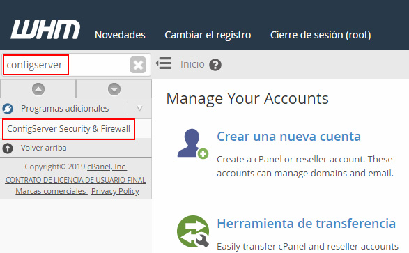 En el buscador principal escribe "configserver" y haz clic en la opción ConfigServer Security & Firewall.