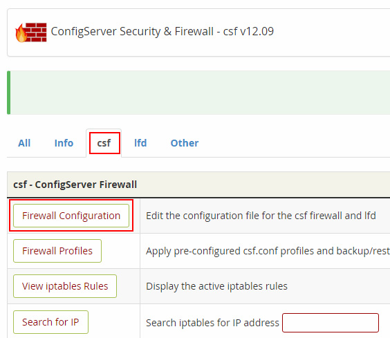 Dentro de las opciones del firewall pulsa en la pestaña CSF y luego en el botón Firewall Configuration.