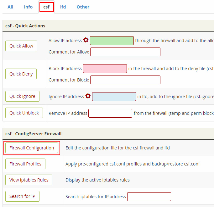 Haz clic en la pestaña CSF y en la sección "csf - ConfigServer Firewall" pulsa en el botón Firewall Configuration.