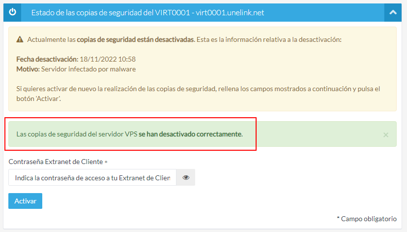 Indica un motivo para la desactivación, introduce tu contraseña de acceso a la Extranet de Cliente y pulsa el botón Desactivar.